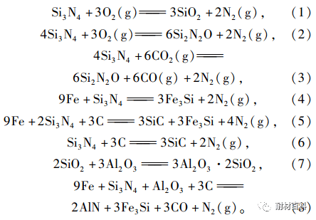 加入氮化硅鐵的炮泥在高溫加熱過(guò)程中,發(fā)生的反應(yīng)除了瀝青的分解、炭化和助燒結(jié)劑的液相燒結(jié)外,主要反應(yīng)就是氮化硅鐵在含碳材料中的反應(yīng),其氣氛主要是含N2、O2、CO2和CO等的混合氣體。其可能發(fā)生的主要反應(yīng)如下: